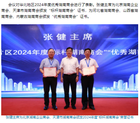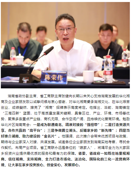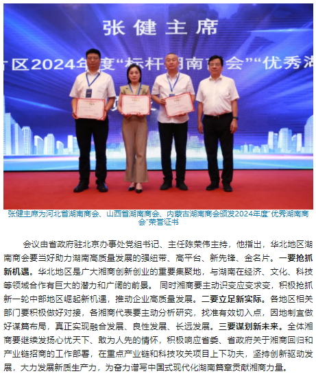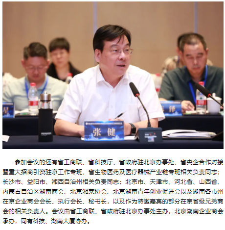 2025年98午,第三华北地区湖南商会联席会议暨湖南重点产业链招商推介会在北京湖南大厦隆重举行。湖南省政协副主席、省工商联主席张健出席会议并讲话
