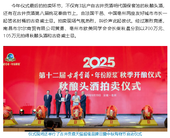 9月19日,北京安徽企业商会会长单位古井集团2025第十二届古井贡酒·年份原浆秋季开酿仪式隆重举行。古井名酒大家庭——古井贡、黄鹤楼、老明光、九酝酒业四品同酿,顺天应时,共启秋酿。重庆、河南、黑龙江、湖南、江西、天津等部分北京省级商会会长、秘书长应邀出席,相聚酒城亳州,共襄秋酿盛典。