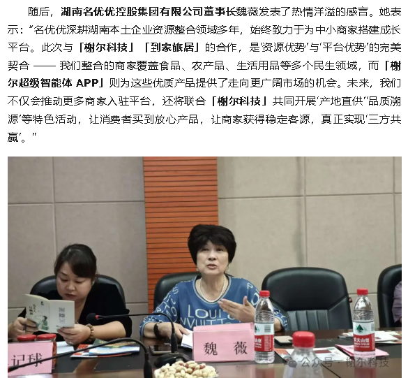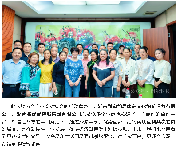 2025 年 9 月 19 日,一场备受瞩目的战略合作交流对接会在长沙市天心区湖南文化艺术产业集团盛大举行。此次会议由湖南到家旅居康养文化旅游运营有限公司湖南名优优控股集团有限公司联合主办,旨在充分发挥双方资源优势,推动名优优相关企业商家资源入驻榭尔超级智能体 APP,共同开拓市场,实现互利共赢。