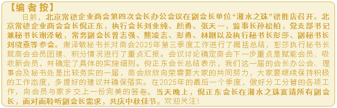 双节临近,秋意渐浓。2025年9月20日下午,北京常德企业商会第四次会长办公会议在副会长单位“湘水之珠”德胜店召开。